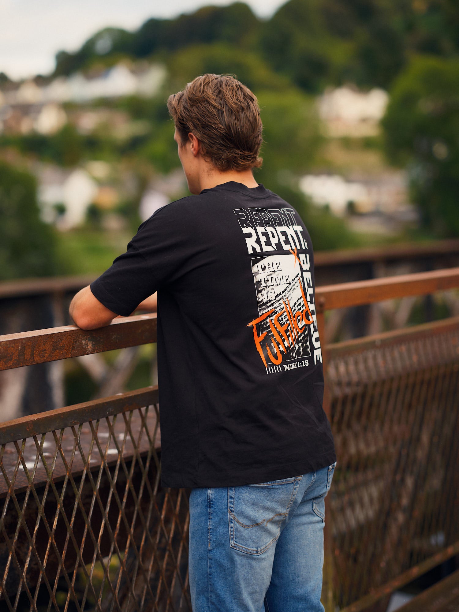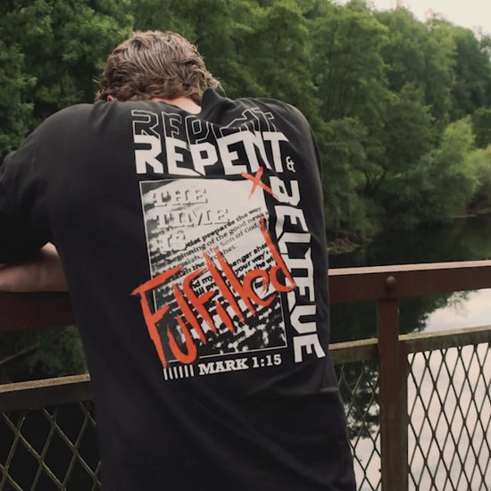 The Time Is Fulfilled Oversized Tee is a bold statement piece designed to stop people in their tracks. With our signature Repent & Believe logo mark printed either large or small across the chest, and a full back poster-style print proclaiming: