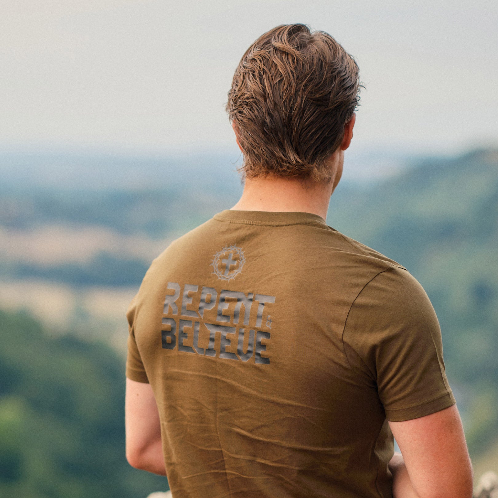 Designed for those unashamed of their faith, the bold t-shirt features a minimalist R&B cross with a reversed “R” on the left chest and a bold Repent & Believe logo across the back.